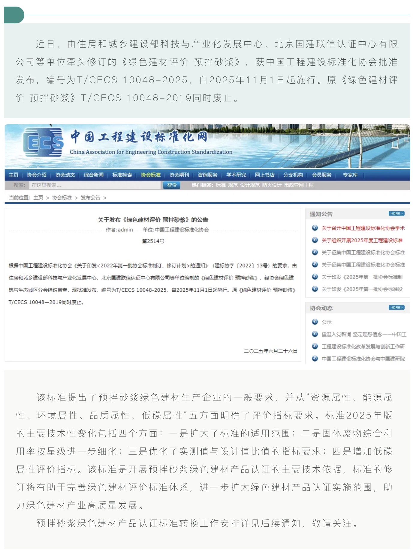 国建认证联合修订的《绿色建材评价 预拌砂浆》标准获批发布
