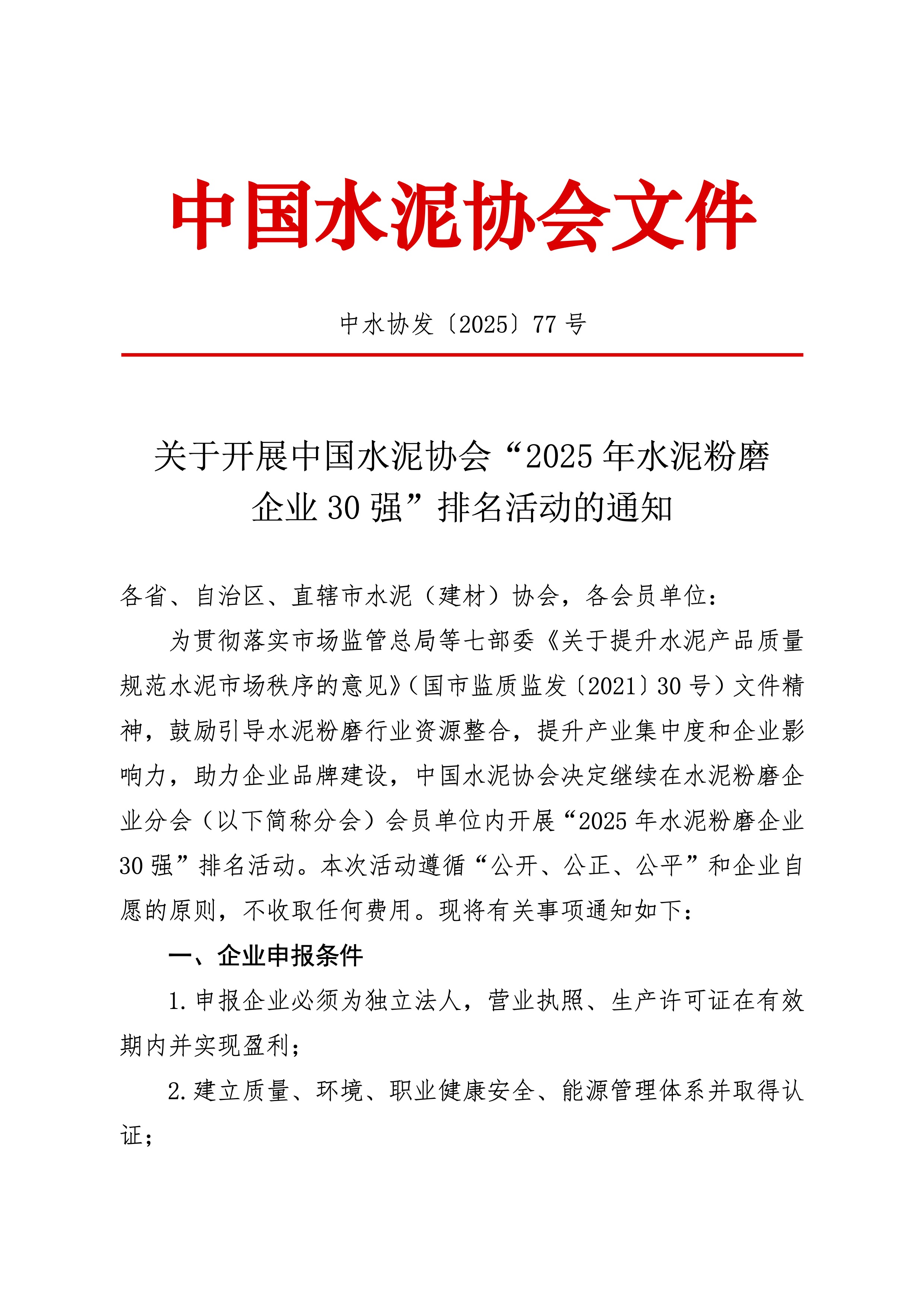关于开展中国水泥协会“2025 年水泥粉磨 企业 30 强”排名活动的通知