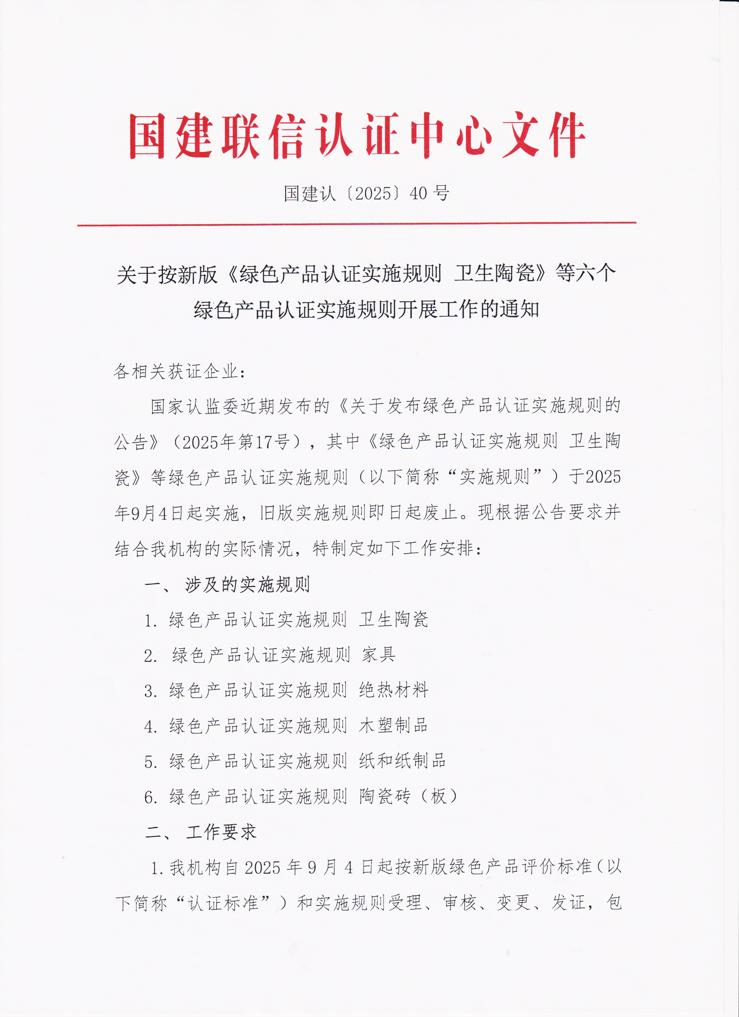 关于按新版《绿色产品认证实施规则卫生陶瓷》》等六个绿色产品认证实施规则开展工作的通知