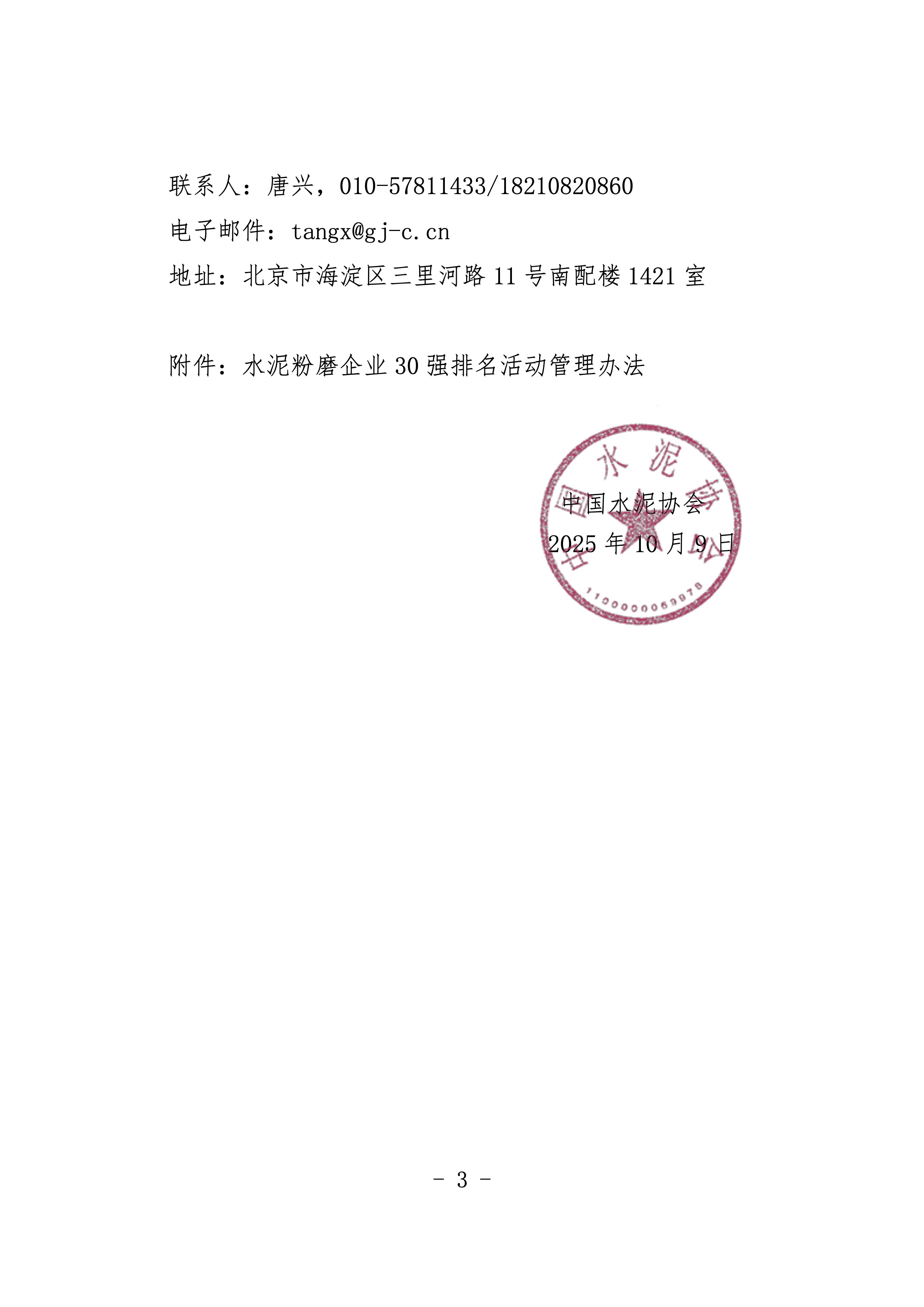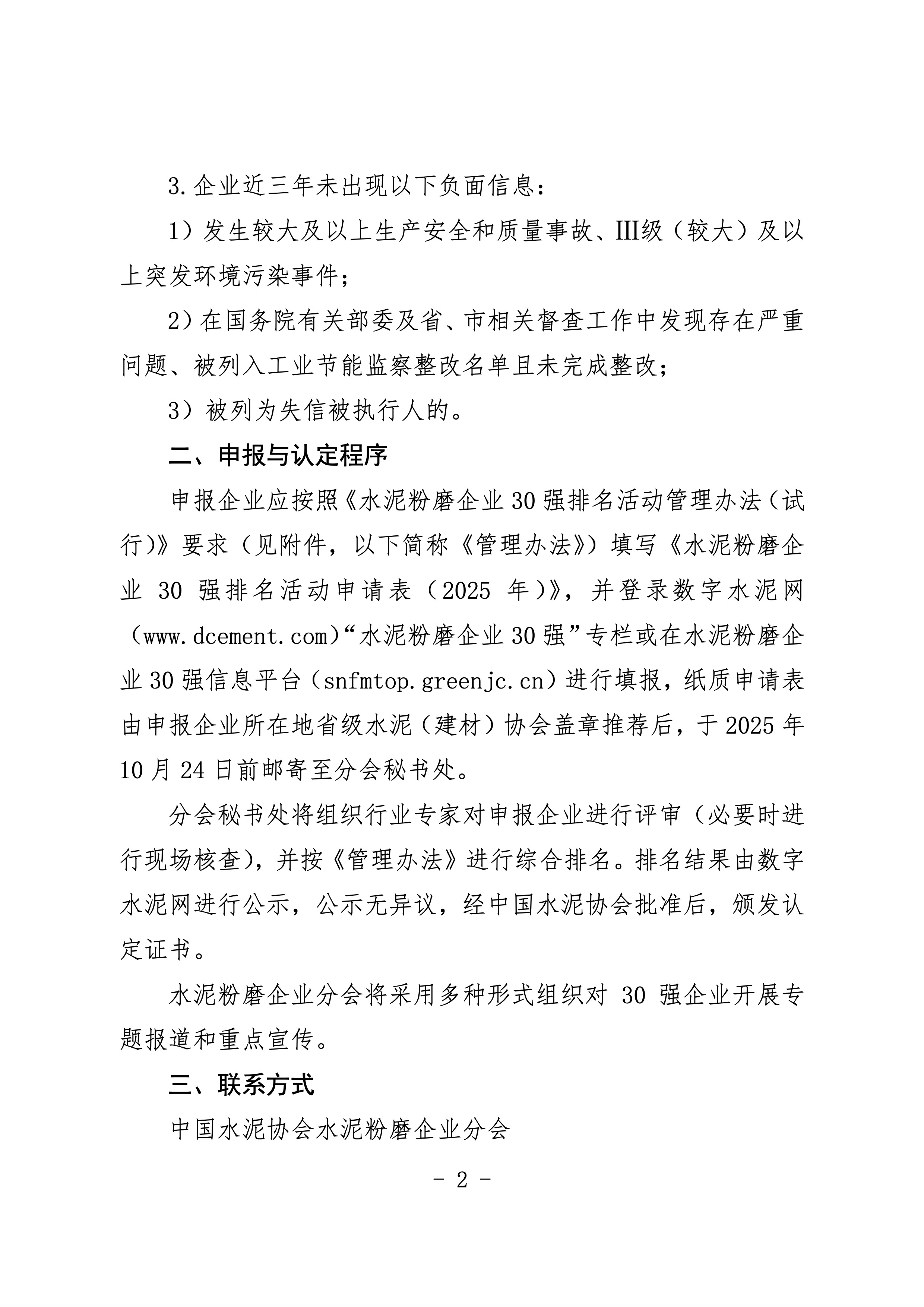 关于开展中国水泥协会“2025 年水泥粉磨 企业 30 强”排名活动的通知