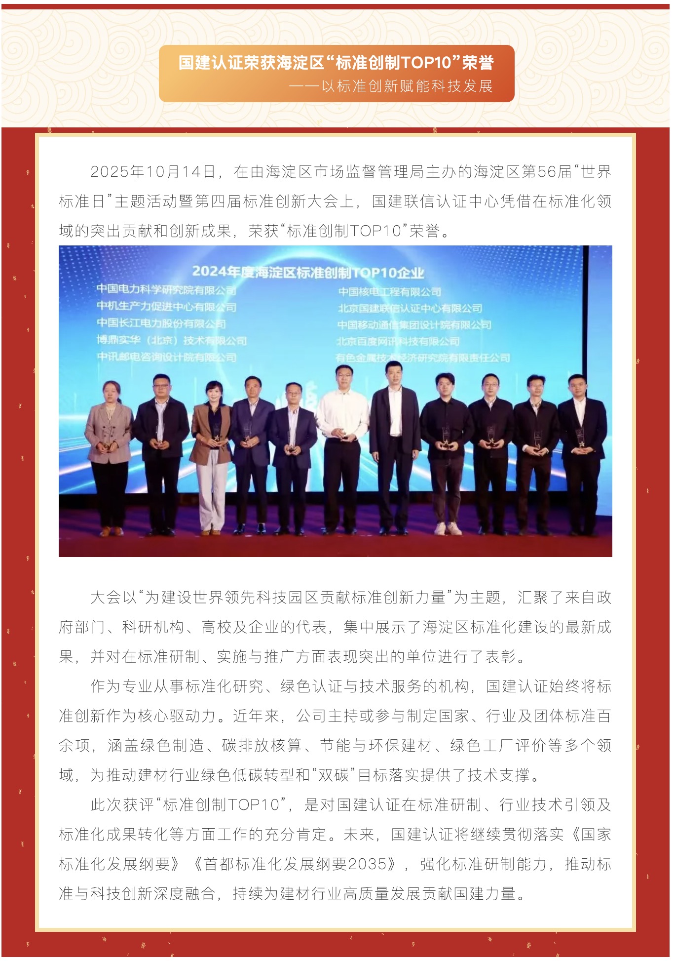 国建认证荣获海淀区“标准创制TOP10”荣誉