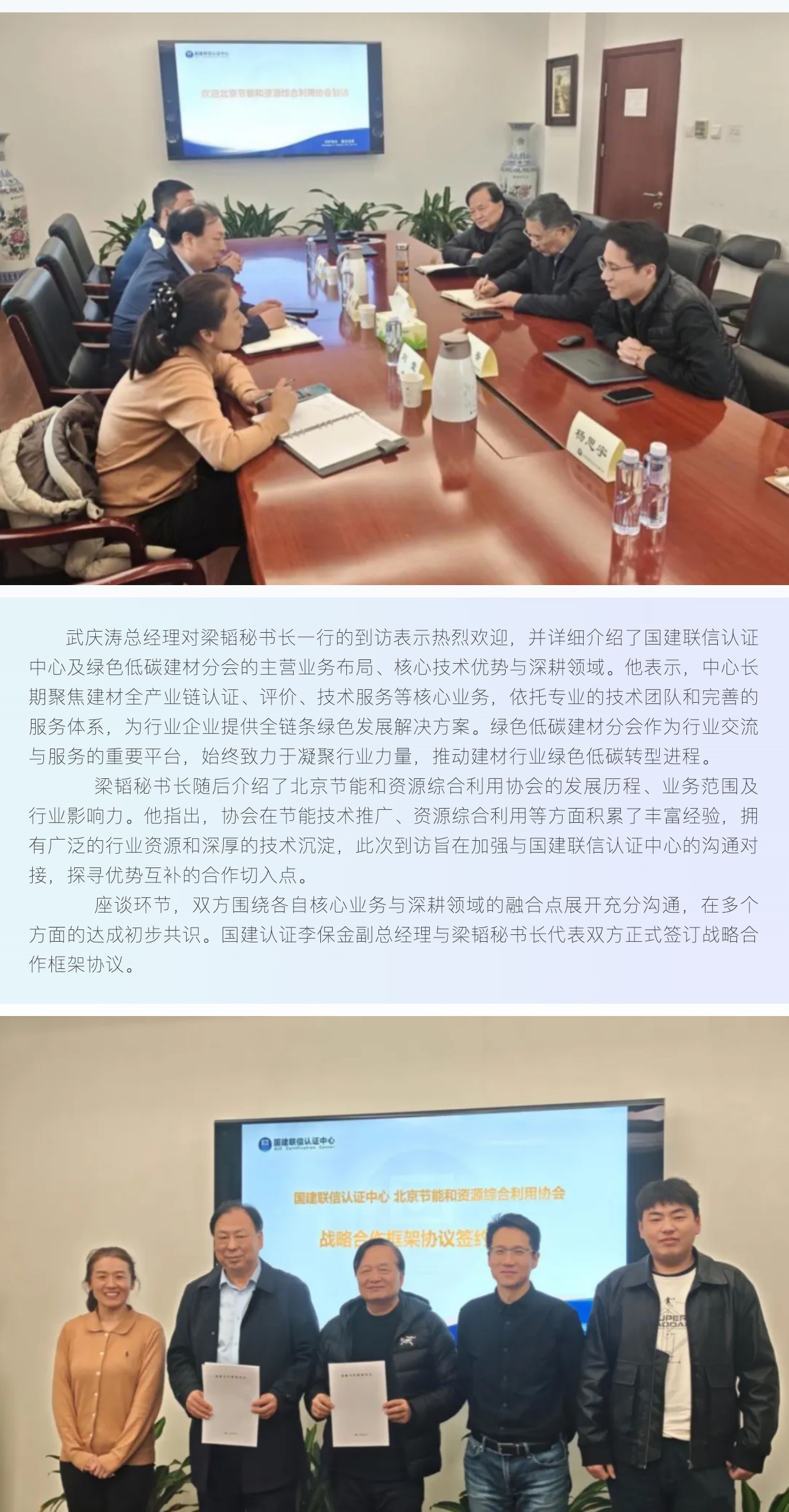 10月22日,北京节能和资源综合利用协会秘书长梁韬、副秘书长刘莹一行到访国建联信认证中心。国建联信认证中心总经理武庆涛、副总经理李保金接待了来宾,双方就深化行业合作、推动绿色低碳发展等议题展开深入交流。行业服务部主任张晋参加座谈。