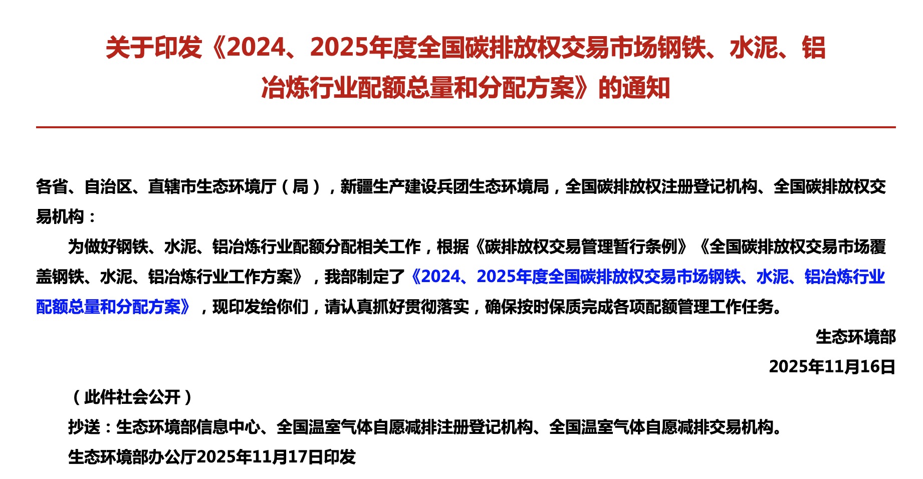 一图读懂 | 《2024、2025年度全国碳排放权交易市场钢铁、水泥、铝冶炼行业配额总量和分配方案》