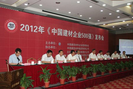 由中国建筑材料企业管理协会主办,中国建筑材料集团有限公司、北京金隅集团有限责任公司、北新集团建材股份有限公司协办的2012年中国建材企业500强发布会于8月30日在北京隆重举行。全国政协常委、国务院参事室参事蒋明麟;中国建材联合会秘书长、中国建材企业管理协会会长张东壮;原国家建材局副局长杨志元;中国建材工业规划研究院院长刘长发和建材企业管理协会副会长、建材500强部分企业代表和相关新闻媒体出席了2012年中国建材企业500强发布会。