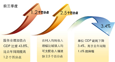 从产业结构看,农业生产形势喜人,粮食产量实现历史性的“九连增”,前三季度服务业增加值占GDP比重比去年同期提高1.2个百分点。