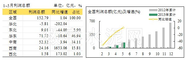 2013年前5个月全国水泥行业实现利润总额152.8亿元,略高于2012年,同比增长1%,从历史同期上看,利润总额是仅低于2011年,位居历史第二位。
