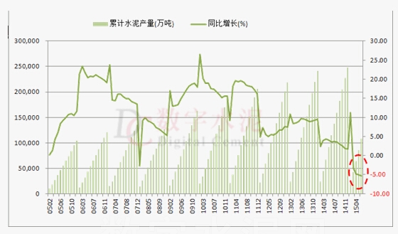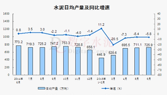 根据国家统计局公布的数据显示,2015年6月份水泥产量21,776万吨,同比下降5.8%;2015年1-6月份全国规模以上水泥产量107,714 万吨,同比负增长5.3%。单月水泥产量和累计水泥产量同比下滑幅度继续扩大 。