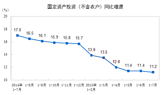 2015年1-7月份,全国固定资产投资(不含农户)288,469亿元,同比名义增长11.2%,增速比1-6月份回落0.2个百分点。从环比看,7月份固定资产投资(不含农户)增长0.75%。
