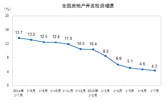 2015年1-7月份,全国房地产开发投资52,562亿元,同比名义增长4.3%,增速比1-6月份回落0.3个百分点。其中,住宅投资35,380亿元,增长3.0%,增速提高0.2个百分点。住宅投资占房地产开发投资的比重为67.3%。