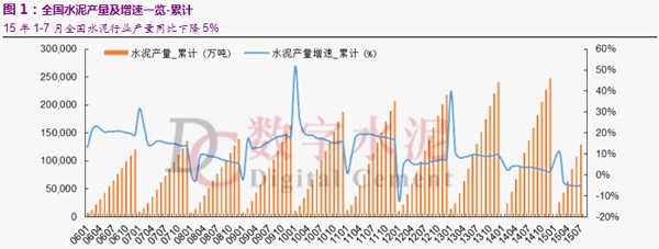 2015年1-7月我国水泥行业产量12.9亿吨,同比下降5%;2015年7月我国水泥行业产量2.1亿吨,同比下降4.7%,环比下降2.7%。2015年1-7月累计增速较1-6月回升0.3个百分点,降幅收窄,但当前水泥行业整体需求自2014年9月以来持续惯性低迷;