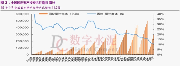 2015年1-7月我国城镇固定资产投资28.8万亿元,增速11.2%,增速较2014年同期下降5.8个百分点,较1-6月下降0.2个百分点;2015年7月我国城镇固定资产投资5.1万亿元,增速9.9%,增速较2014年同期下降5.8个百分点;