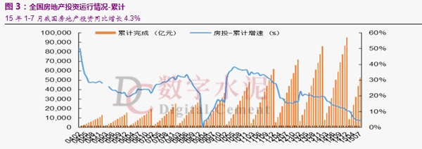 2015年1-7月国内房地产投资累计完成5.3万亿元,增速4.3%,增速较2014年同期下降9.4个百分点;2015年7月国内房地产投资完成0.86万亿元,增速2.9%,增速较2014年同期下降9个百分点;