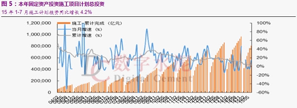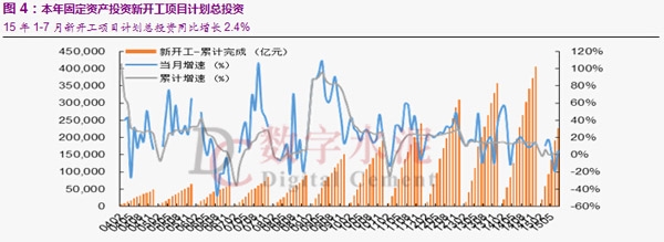 2015年1-7月新开工项目计划总投资22.7万亿元,增速2.4%,增速较2014年同期下降12.2个百分点,单7月新开工项目计划总投资同比增速4.8%;施工项目计划总投资80.7万亿元,增速4.2%,增速水平较2014年同期下降8.9个百分点,单7月施工项目计划总投资同比增速14.8%;