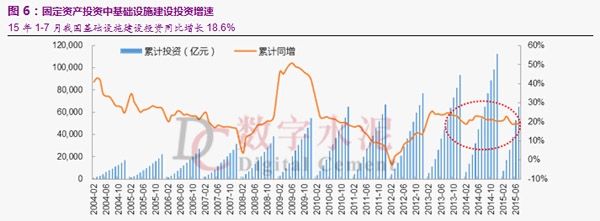 2015年1-7月我国基础设施建设投资6.5万亿元,增速18.6%; 2012年下半年至今一直作为“稳增长”引擎。