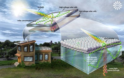 “这项新兴技术是将一部分透射光分散在玻璃窗上,被纳米粒子(半导体量子点)吸收,然后重新发射出肉眼看不见的红外波长,再被传导到窗户边框上的太阳能电池上。”洛斯阿拉莫斯国家实验室首席研究员维克多·克里莫夫说。