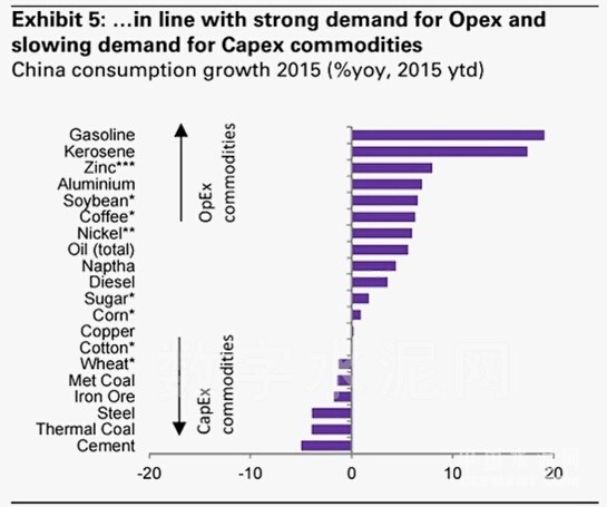 调查显示,今年迄今,中国对资本支出相关原物料的需求逐渐萎缩,对营运开支相关原物料的需求却日益增加。举例来说,水泥的需求量较去年同期萎缩 5%,但汽油需求却年增了19.1%之多,而咖啡的消耗量也有增加趋势。