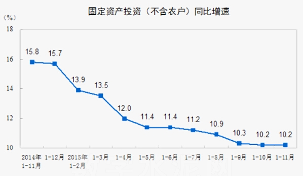 2015年1-11月份,全国固定资产投资(不含农户)497,182亿元,同比名义增长10.2%,增速与1-10月份持平。从环比速度看,11月份固定资产投资(不含农户)增长0.73%。
