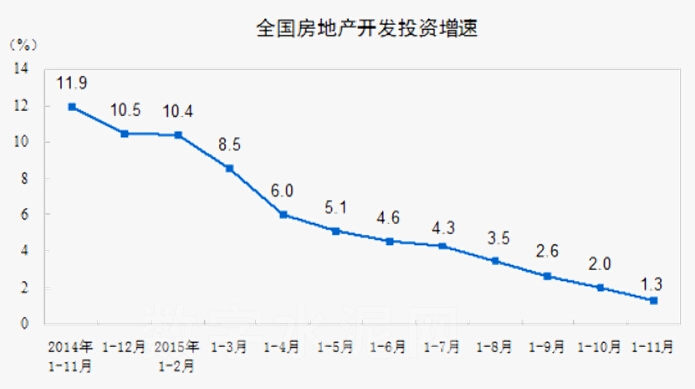 2015年1-11月份,全国房地产开发投资87,702亿元,同比名义增长1.3%,增速比1-10月份回落0.7个百分点。其中,住宅投资59,069亿元,增长0.7%,增速回落0.6个百分点。住宅投资占房地产开发投资的比重为67.4%。