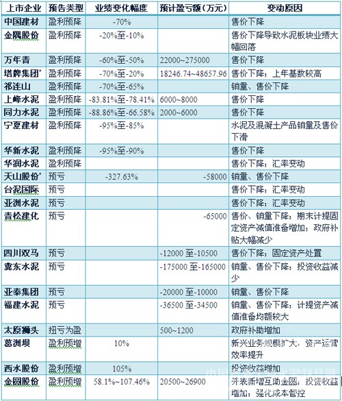 表1:水泥上市公司业绩预告情况