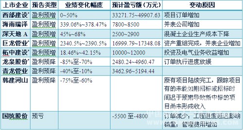 商品混凝土企业上市公司西部建设、海南瑞泽和深天地预计2015年盈利均实现同比增加,而制品企业中只有巨龙管业和柘中建设预期实现盈利增长,国统股份预计亏损,其余三个企业包括2015年新进入A股市场的韩建河山均为盈利同比下降。