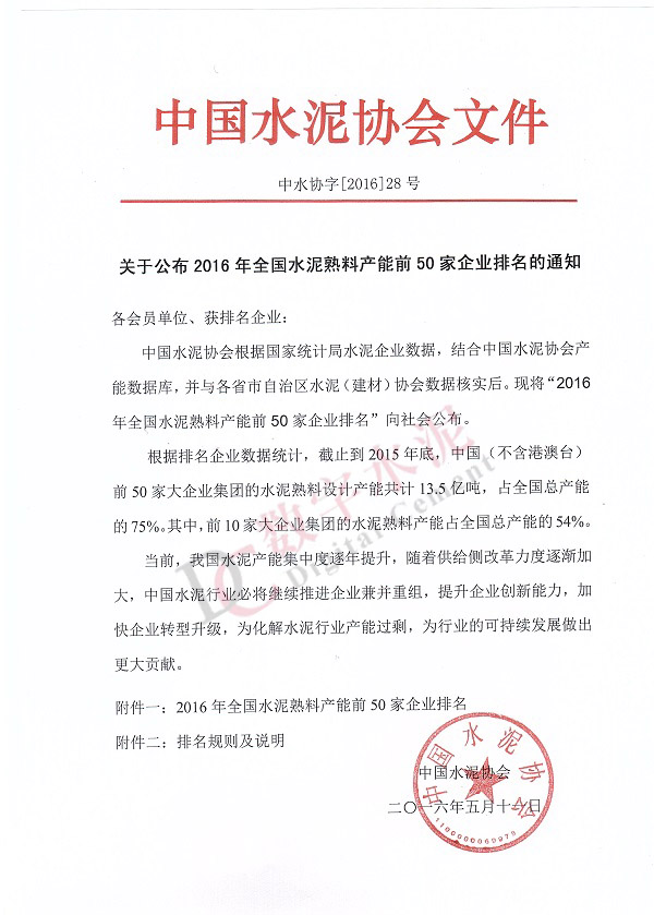 中国水泥协会公布2016全国水泥熟料产能集团企业排名