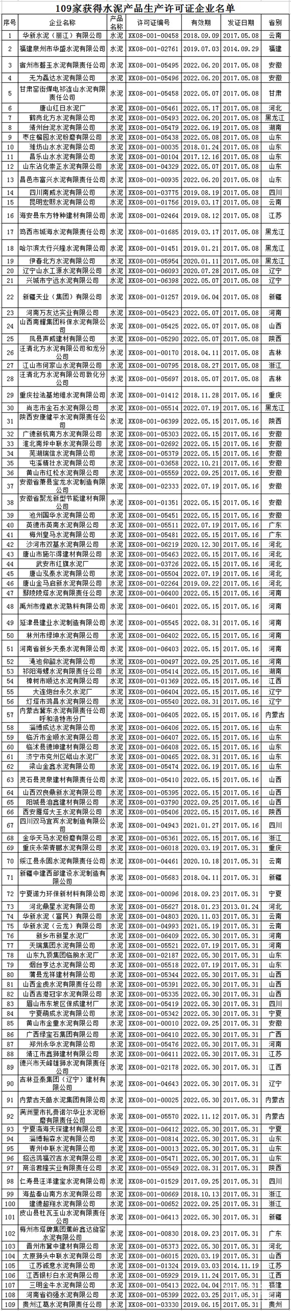 中国水泥网从国家质量监督检验检疫总局获悉,今年5月获水泥生产许可的企业共计109家。