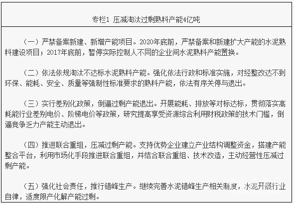 1、加快淘汰落后产能优化结构,推进企业联合重组,化解产能过剩,实现压减淘汰过剩熟料产能4亿吨。