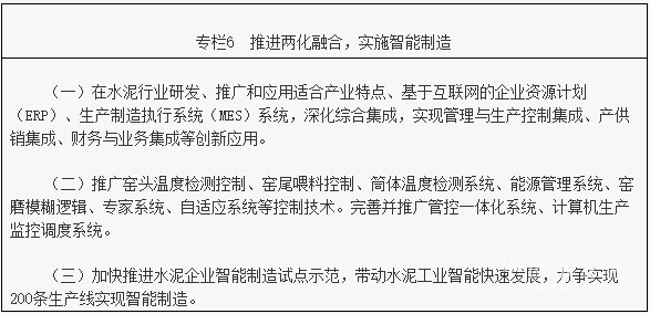 贯彻落实《中国制造2015》,通过政策引导和鼓励,进一步加快推动水泥行业两化融合工作,提升水平全面推广,实现智能制造、控制、管理。