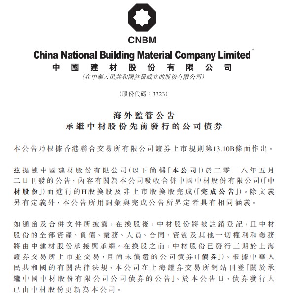 中国建材承继中材股份先前发行的公司债券