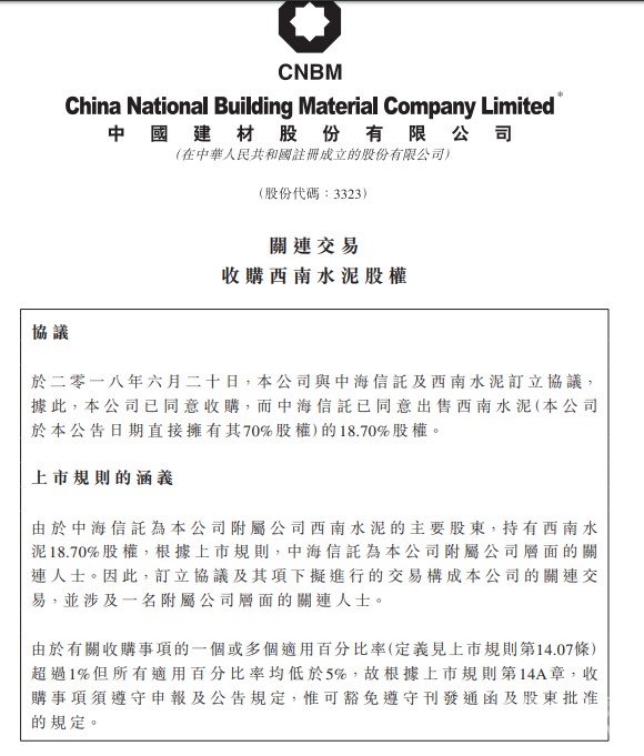 中国建材(03323)公布,于2018年6月20日,该公司与中海信托及西南水泥订立协议,该公司拟向中海信托收购西南水泥18.70%股权,总代价为19.18亿元人民币。