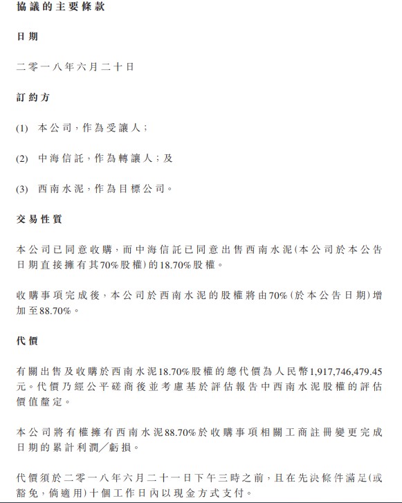 收购事项完成后,该公司于西南水泥的股权将由70%增加至88.70%。