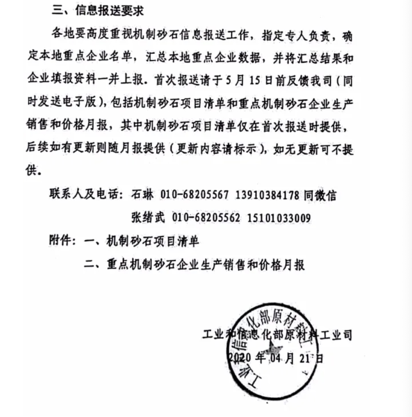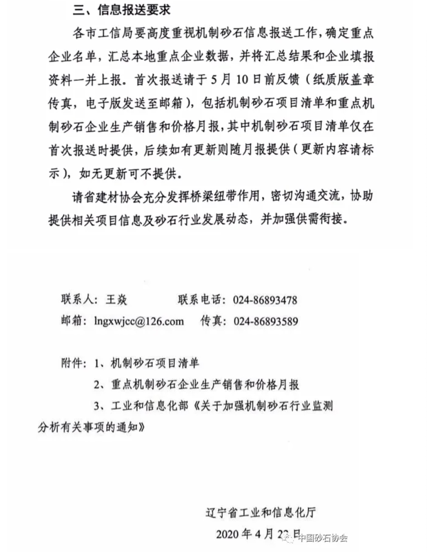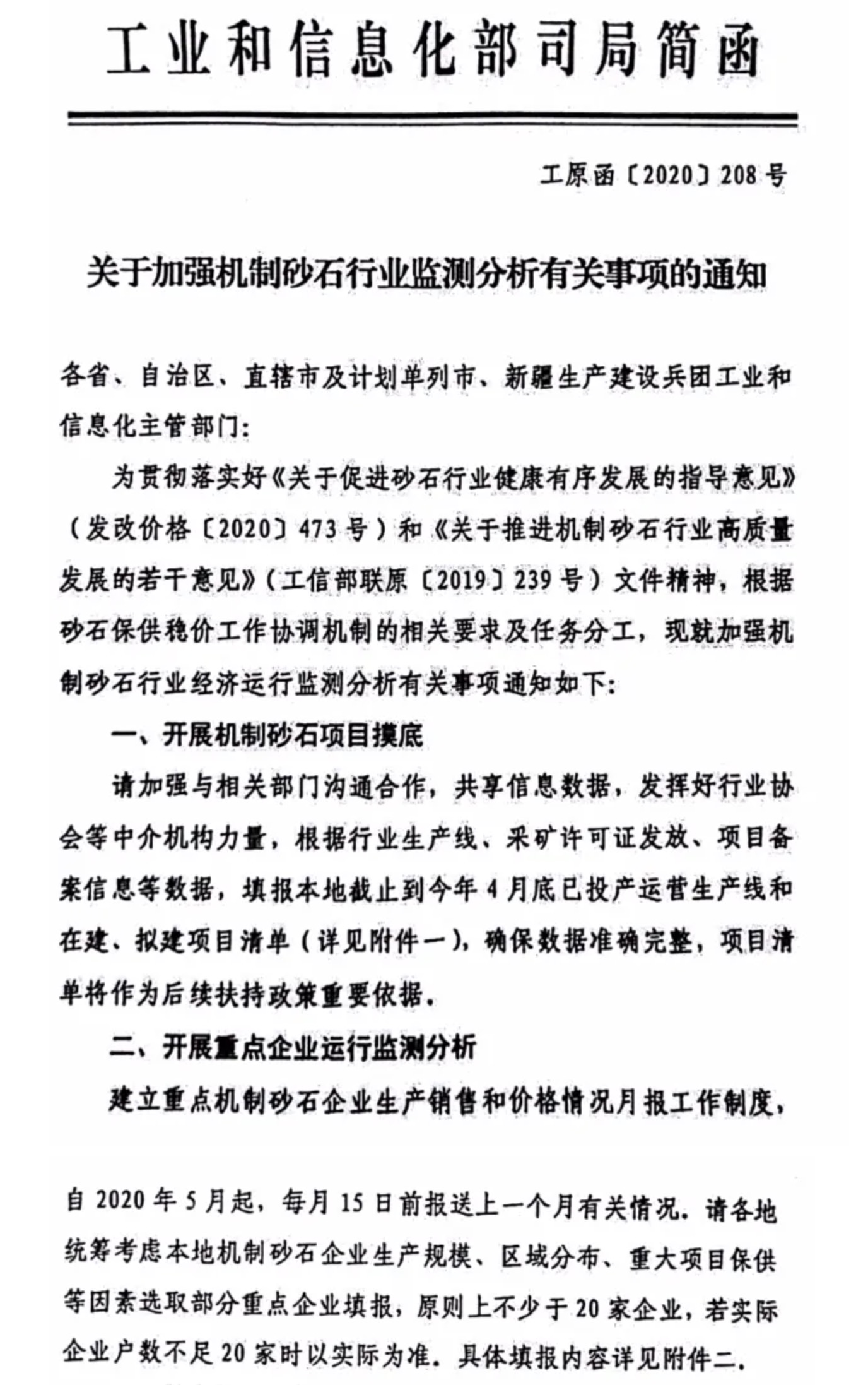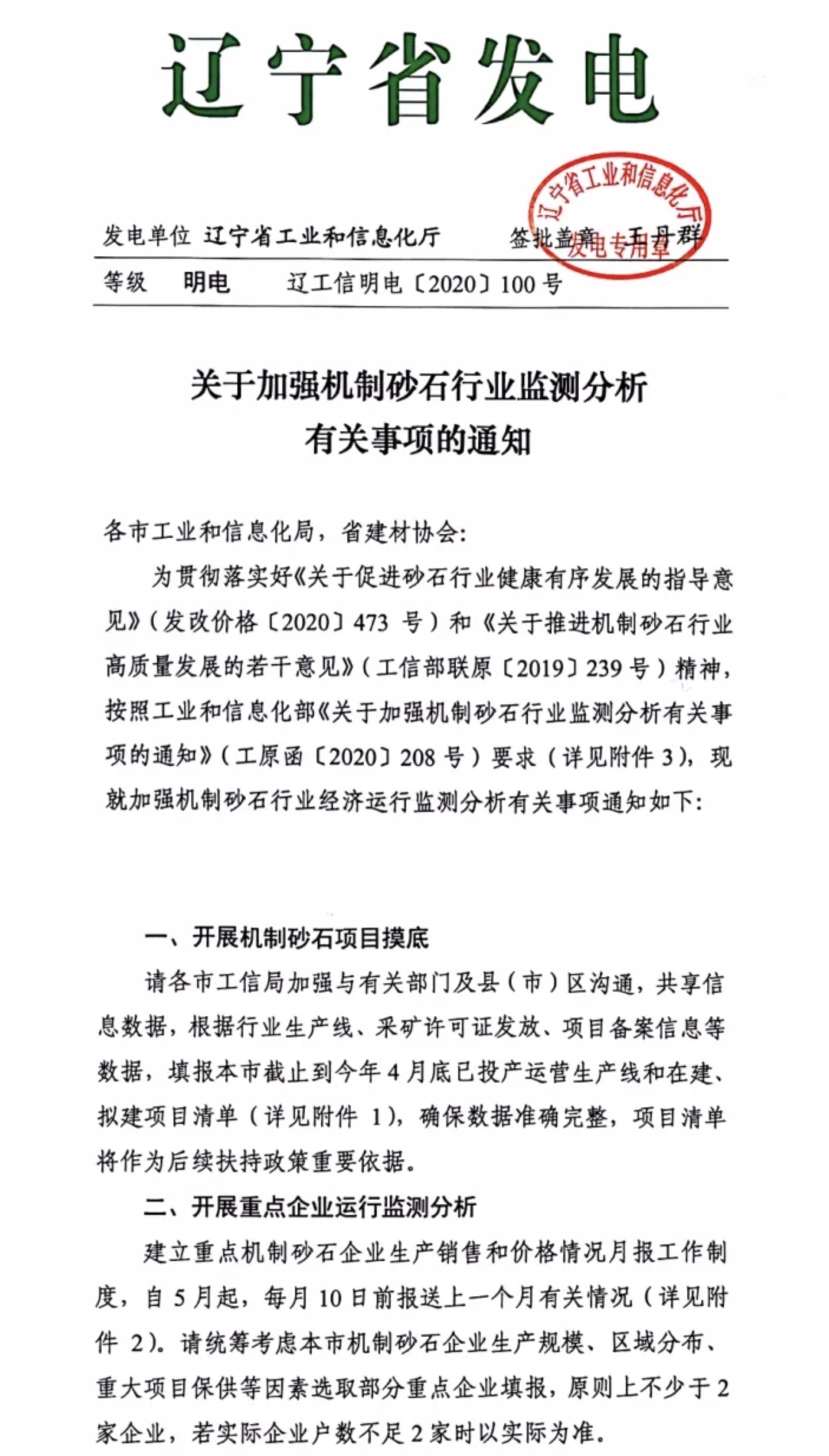 在工业和信息化部发布文件后,不少地区紧随其后发布相关文件。辽宁、吉林等地也相继发布了《关于加强机制砂石行业监测分析有关事项的通知》。