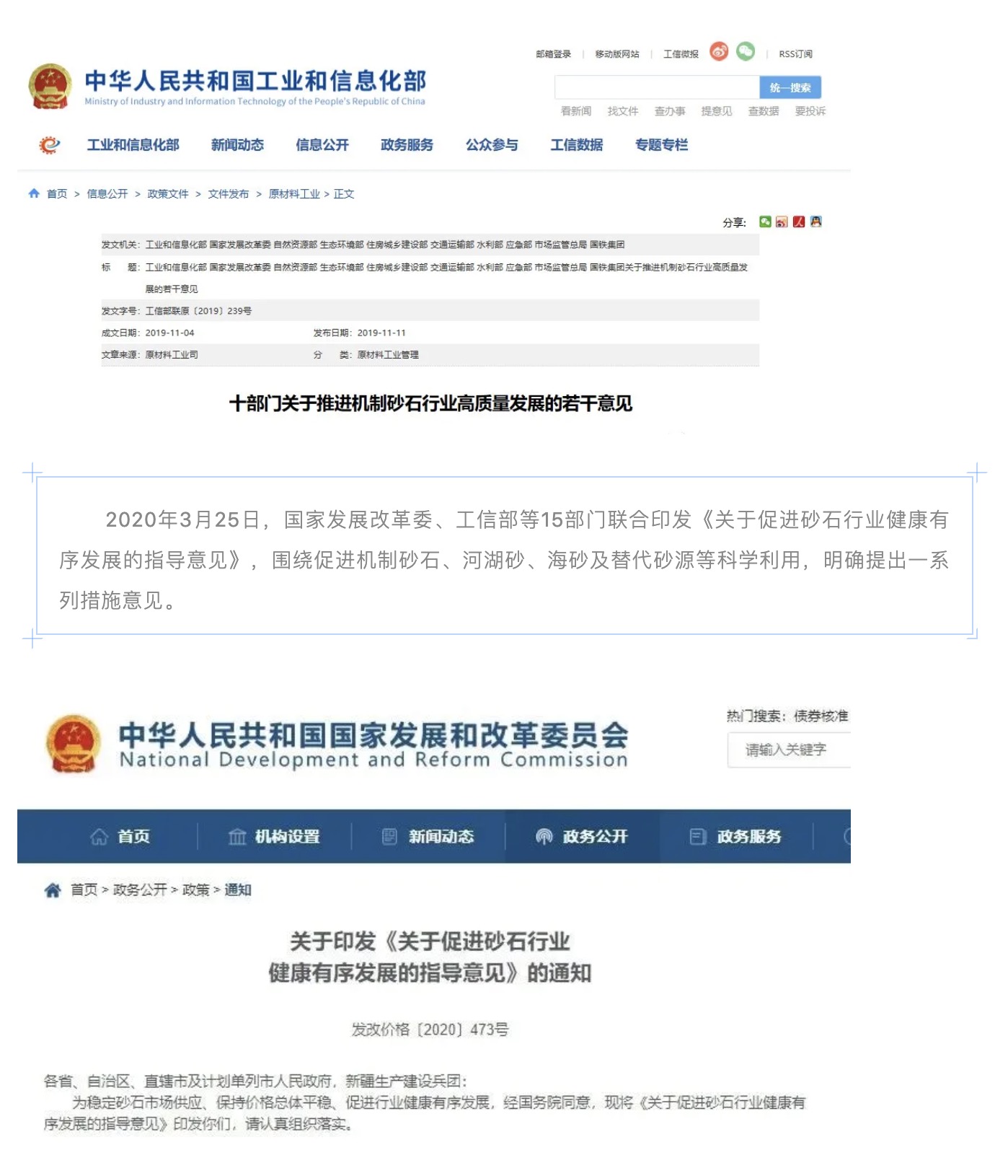 砂石是工程建设中最基本且不可或缺的建筑材料。2019年11月4日,工业和信息化部、国家发展改革委、自然资源部、生态环境部、住房和城乡建设部等十部门联合发布了《关于推进机制砂石行业高质量发展的若干意见》(以下简称《意见》),《意见》提出了机制砂石行业高质量发展的目标——到2025年,形成较为完善合理的机制砂石供应保障体系,做好机制砂石行业的发展规划指导和监督管理。