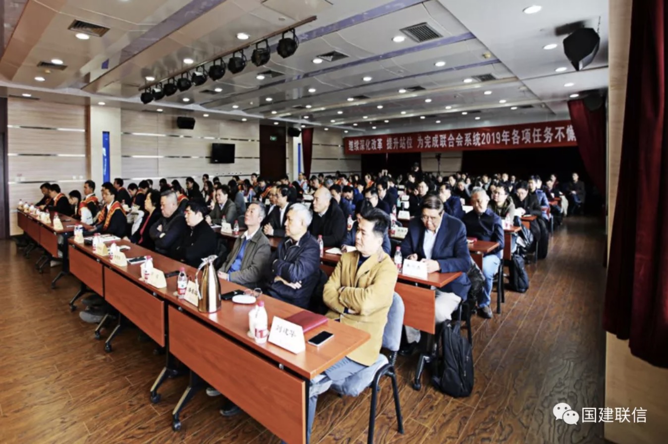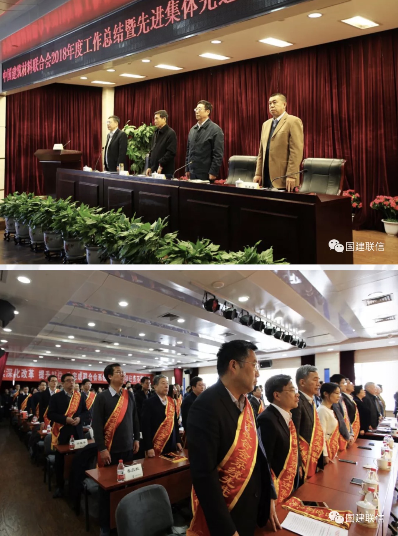 中国建筑材料联合会2018年度工作总结先进表彰大会在雄壮的国歌声中召开。会场后方上悬挂的横幅--继续深化改革 提升站位 为完成联合会系统2019年各项任务不懈奋斗。