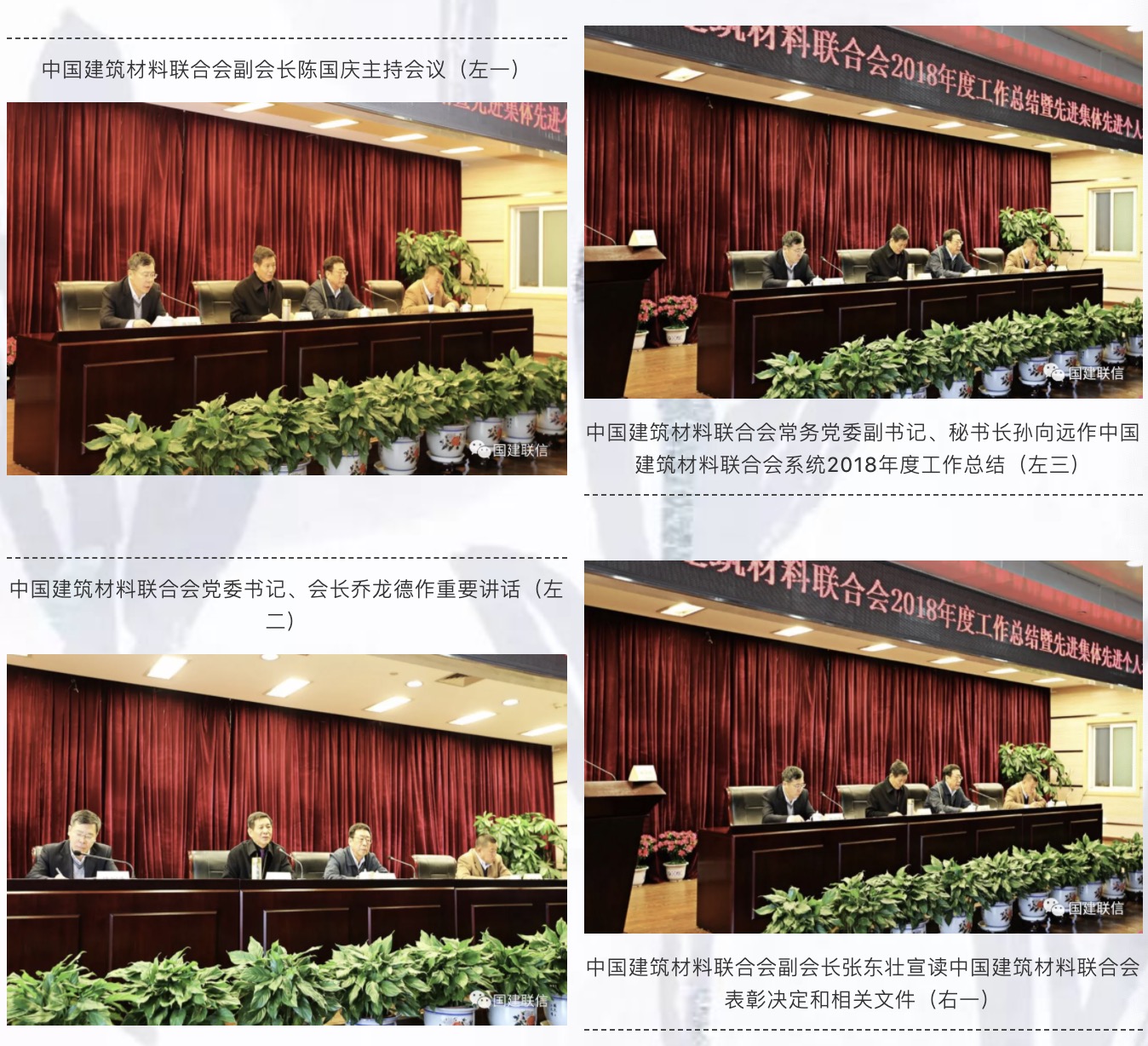 为认真总结中国建筑材料联合会系统2018年改革、发展、党建、廉政建设、队伍建设、文化建设和服务行业等各方面所取得的进展、成绩和经验,表彰2018年的先进集体和先进个人,在全系统形成奋发图强、锐意进取、积极向上的精神风貌和勇于负责、敢于担当的优良作风,在习近平新时代中国特色社会主义思想指引下,以新目标、新要求、新作为、新风貌和新气象开启2019年的新征程,全面做好2019年改革和发展各项工作、再创新佳绩、再创新辉煌。1月31日上午,中国建筑材料联合会2018年工作总结暨先进集体先进个人表彰大会在北京召开。