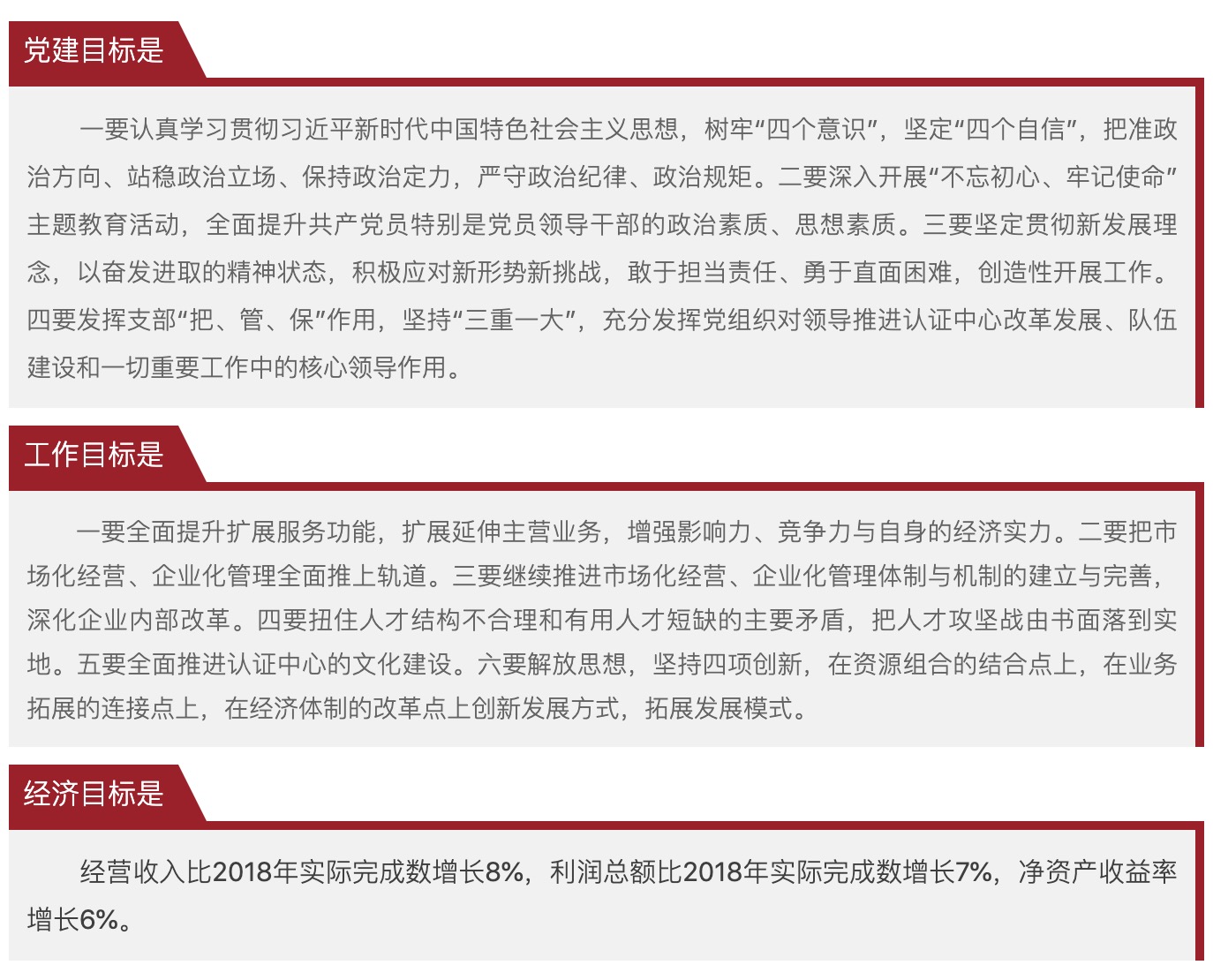 2019年是认证中心实现三年目标的关键之年,认证中心将在中国建筑材料联合会的领导下,坚定“四个自信”,牢固树立“四个意识”,践行“两个维护”,全面贯彻落实党的十九大精神,认真学习和落实新时代的内涵,将政治站位,思想定位,目标定位与党中央保持高度一致,以党的政治建设为统领,切实加强党的建设、业务建设、制度建设、人才建设和文化建设工作。坚持执行建材联合会“引领、协调、服务”的发展宗旨和定位,按照“中建材联综发〔2019〕25号”文件精神要求,紧紧围绕联合会系统2019年制订目标的“12项重点工作”,包括直属单位的六项重点任务,按照中心三年发展目标及“345工程”建设思想,创新思维方式、创新领导方法和工作方法、创新发展模式和体制机制,立足认证中心的主营工作,拓展业务横向功能,延伸业务纵向产业链,推进企业化管理。认证中心全体职工将坚定信心、勇于担当,继续推进认证中心改革和发展,坚持服务为本、质量第一、效益优先。