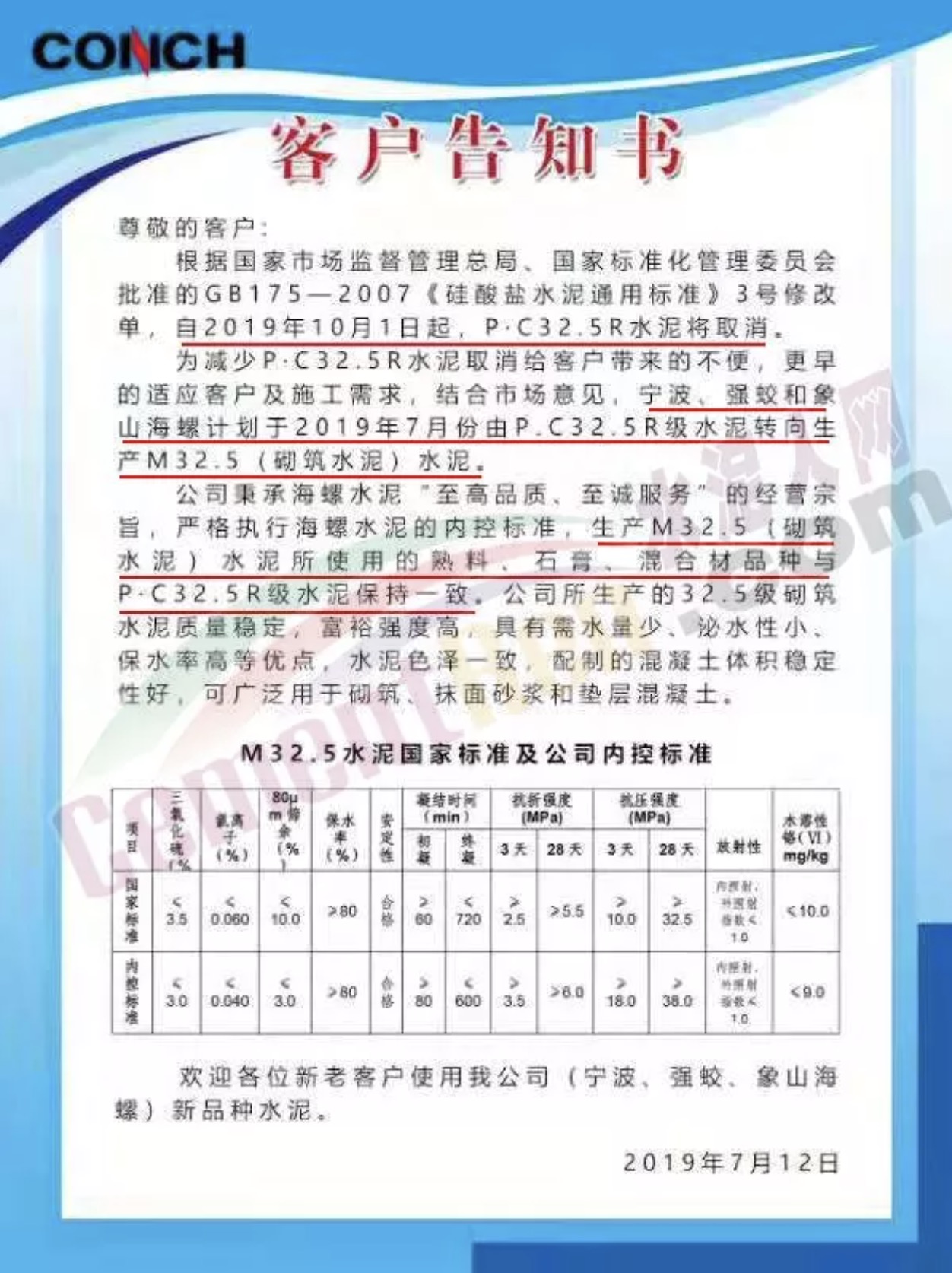 2、2019年8月1日至2019年9月30日为宣传和并行期,在此期间PC32.5R水泥与砌筑M32.5水泥并行销售,以方便广大用户工程施工转换工作。