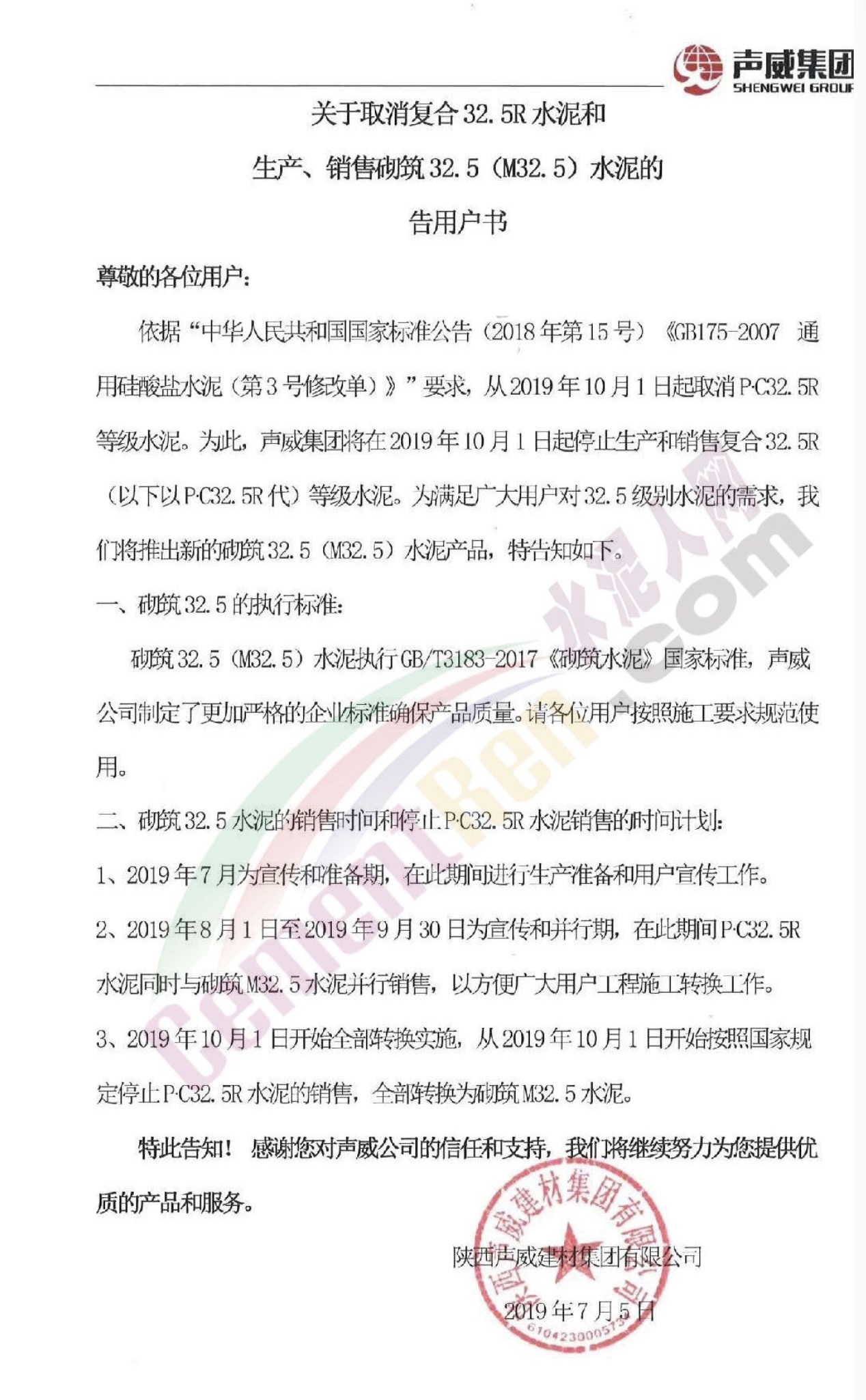 陕西声威集团的告用户书称:根据“中华人民共和国国家标准公告(2018年第15号)《GB175-2007通用硅酸盐水泥(第3号修改单)》”要求,从2019年10月1日起取消PC32.5R等级水泥。为此声威集团将在2019年10月1日起停止生产和销售复合32.5R(以下以PC32.5R代)等级水泥。为满足广大用户对32.5级别水泥的需求,声威集团将推出新的砌筑32.5(M32.5)水泥产品。