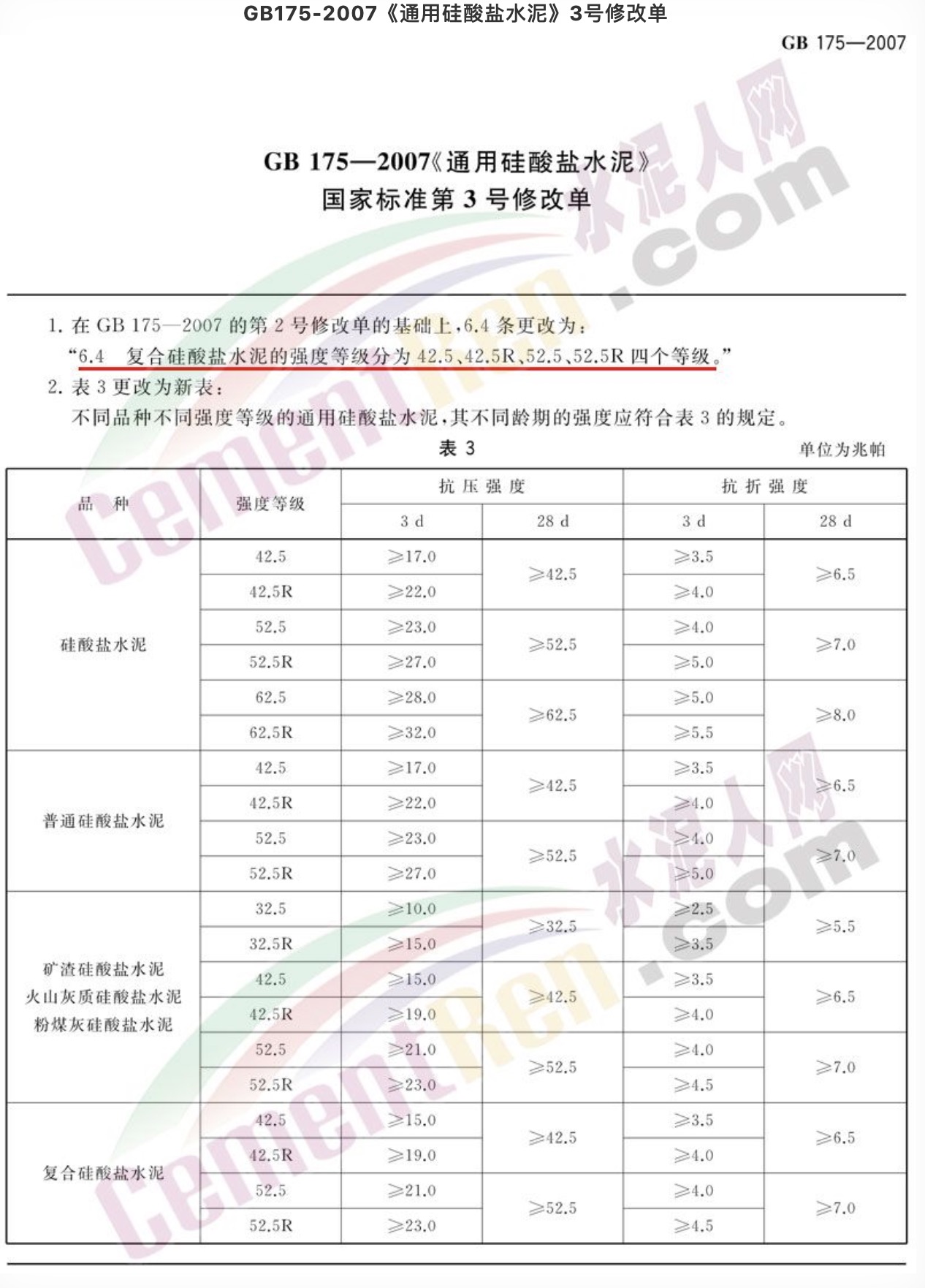 据水泥人网了解,上述海螺水泥及声威集团告用户书中提到的中华人民共和国国家标准公告(2018年第15号)《GB175-2007通用硅酸盐水泥(第3号修改单)》是由国家市场监督管理总局、国家标准化管理委员会批准自2019年10月1日起正式实施的。3号修改单的主要内容是“全面取消32.5复合硅酸盐水泥”。