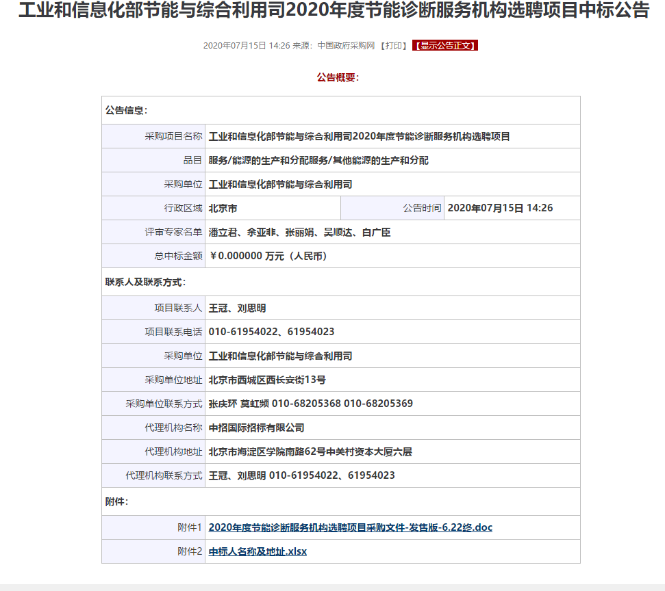 2020年7月15日,中国政府采购网中国政府购买服务信息平台公布了“工业和信息化部节能与综合利用司2020年度节能诊断服务机构选聘项目中标公告”,北京国建联信认证中心有限公司(以下简称“GJC”)顺利中标。