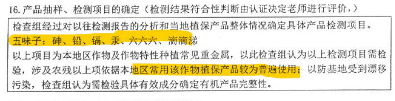 企业生产基地位于XX省XX市XX镇。公司于2014年4月建立并运行有机产品生产管理体系,于2014年9月20日获得有机转换认证证书。机构2015年10月1日出具的《有机产品认证检查报告》描述:“检查组经过对以往检测报告的分析和当地植保产品整体情况确定具体产品检测项目。五味子:砷、铅、镉、汞、六六六、滴滴涕” “……涉及农残以上项目依据本地区常用该作物植保产品较为普遍使用”。专项监督的现场检查中发现企业的产品检测报告仅检测了六六六和滴滴涕,而对该作物在当地有较高使用可能的多菌灵等化学农药没有检测。抽查机构相关档案因为机构检查组风险评估认为当地常用六六六和滴滴涕(证据1见图3-16),因此选取了这两个项目,而没有选取其他当地常规生产中大量使用的农药。专项监督检查组与当地农业部门及其他相关部门的核实,获知当地实际已有近30年没有使用过六六六和滴滴涕了,当地也无处购买这两种农药。