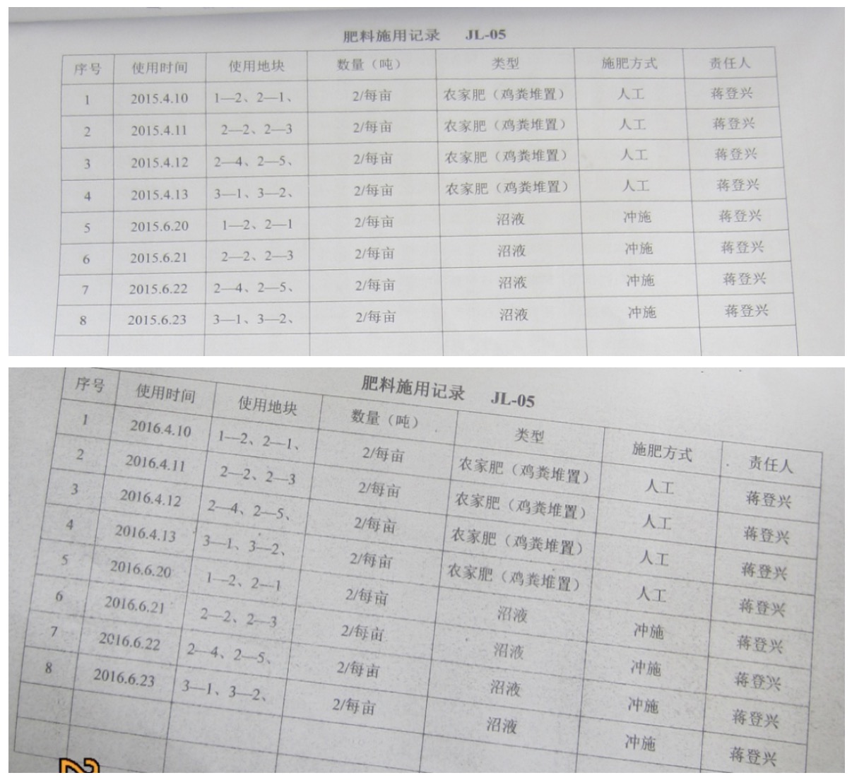 图3-20 证据1:企业提供的2015年和2016年的肥料施用记录