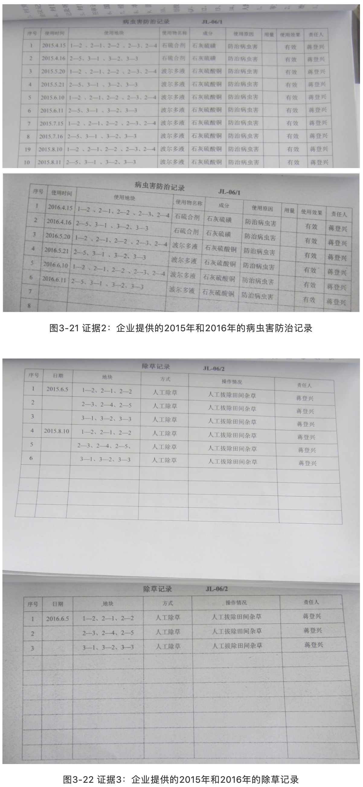 专项监督现场检查中企业仅能提供2015年和2016年的农事记录,但其提供这两年的农事记录(包括肥料施用记录、病虫害防治记录、除草记录)除年份不同外,其操作时间、操作内容、操作人等完全一致,明显为编造的记录(证据1、证据2、证据3见图3-20,图3-21,图3-22);企业提供的投入品购买单据为连号收据,而购买时间分别为2015年3月25日(票据编号为7975418)和2015年6月25日(票据编号7975417),购买时间的前后顺序与收据号码的顺序无法对应,购买收据不具备可信性和真实性。(证据4见图3-23)。