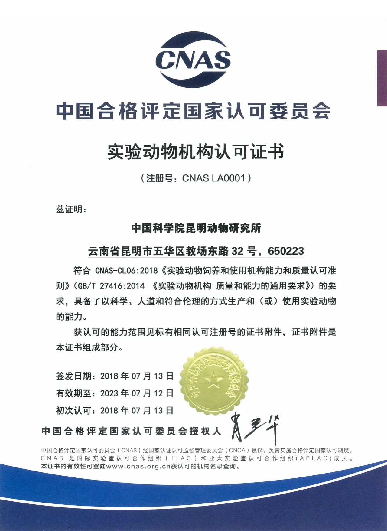 2018年7月13日,中国合格评定国家认可委员会(CNAS)为中国科学院昆明动物研究所(以下简称昆明动物研究所)颁发了我国第一张实验动物机构认可证书。这标志着我国自主研发、创新建立的实验动物机构认可制度正式实施。