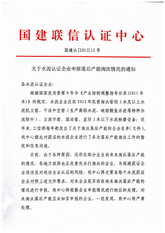 关于水泥认证企业申报落后产能淘汰情况的通知