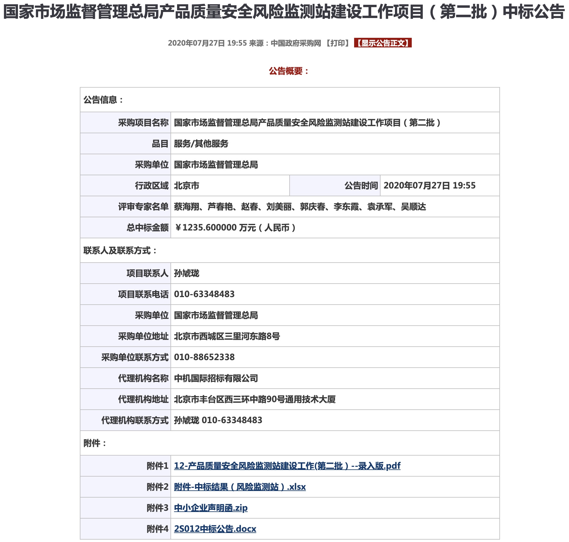 2020年7月27日,中国政府采购网中国政府购买服务信息平台公布了“国家市场监督管理总局产品质量安全风险监测站建设工作项目(第二批)中标公告”,北京国建联信认证中心有限公司(以下简称“GJC”)作为联合体成员分别中标“水嘴行业产品质量安全风险监测站”、“陶瓷砖行业产品质量安全风险监测站”两个项目。