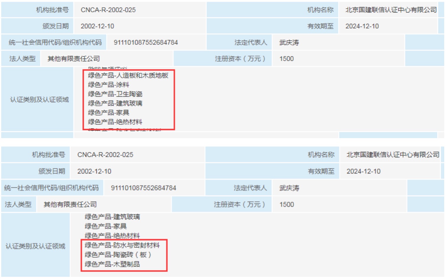2020年8月3日,北京国建联信认证中心有限公司获批绿色产品认证机构资质,成为建材领域首家绿色产品认证机构,认证领域包括:陶瓷砖(板)、卫生陶瓷、建筑玻璃、防水与密封材料、绝热材料、涂料、家具、人造板和木质地板、木塑制品。