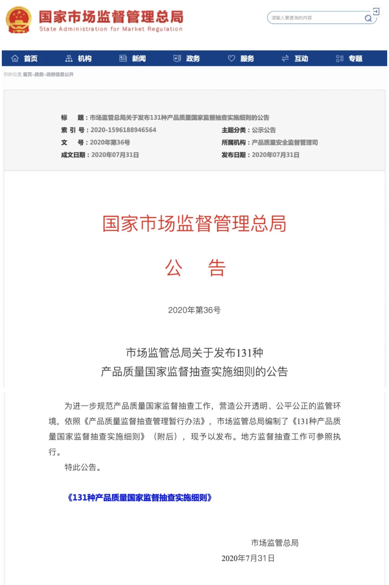 7月31日,国家市场监督管理总局发布《131种产品质量国家监督抽查实细则》,称为进一步规范产品质量国家监督抽查工作,营造公开透明、公平公正的监管环境,依照《产品质量监督抽查管理暂行办法》,市场监管总局编制了《131种产品质量国家监督抽查实施细则》,其中包括《水泥产品质量国家监督抽查实施细则》。