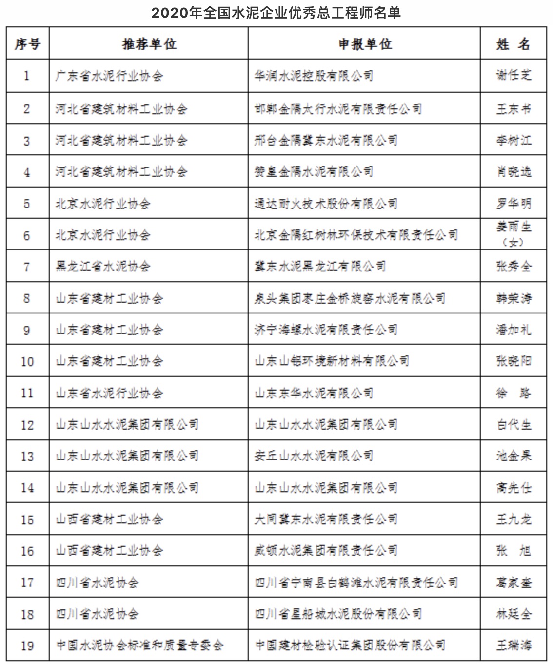 为全方位提升水泥产业的技术装备水平,实施水泥企业的进一步节能减排,使中国水泥技术装备实现中国制造和中国创造并举,达到国际领先水平,中国水泥协会于2020年2月开展了“2020年全国水泥企业优秀总工程师”评选活动。该项评选工作按照既定程序进行了评审、审定,并在中国水泥协会微信公众号、数字水泥网进行了公示。