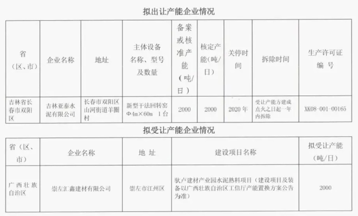 吉林省工信厅:日前,吉林工业和信息化厅发布《吉林亚泰水泥有限公司2000t/d水泥熟料生产线产能指标出让的公示》,公示显示,吉林亚泰水泥有限公司一条2000t/d水泥熟料生产线产能指标置换给广西崇左汇鑫建材有限公司。